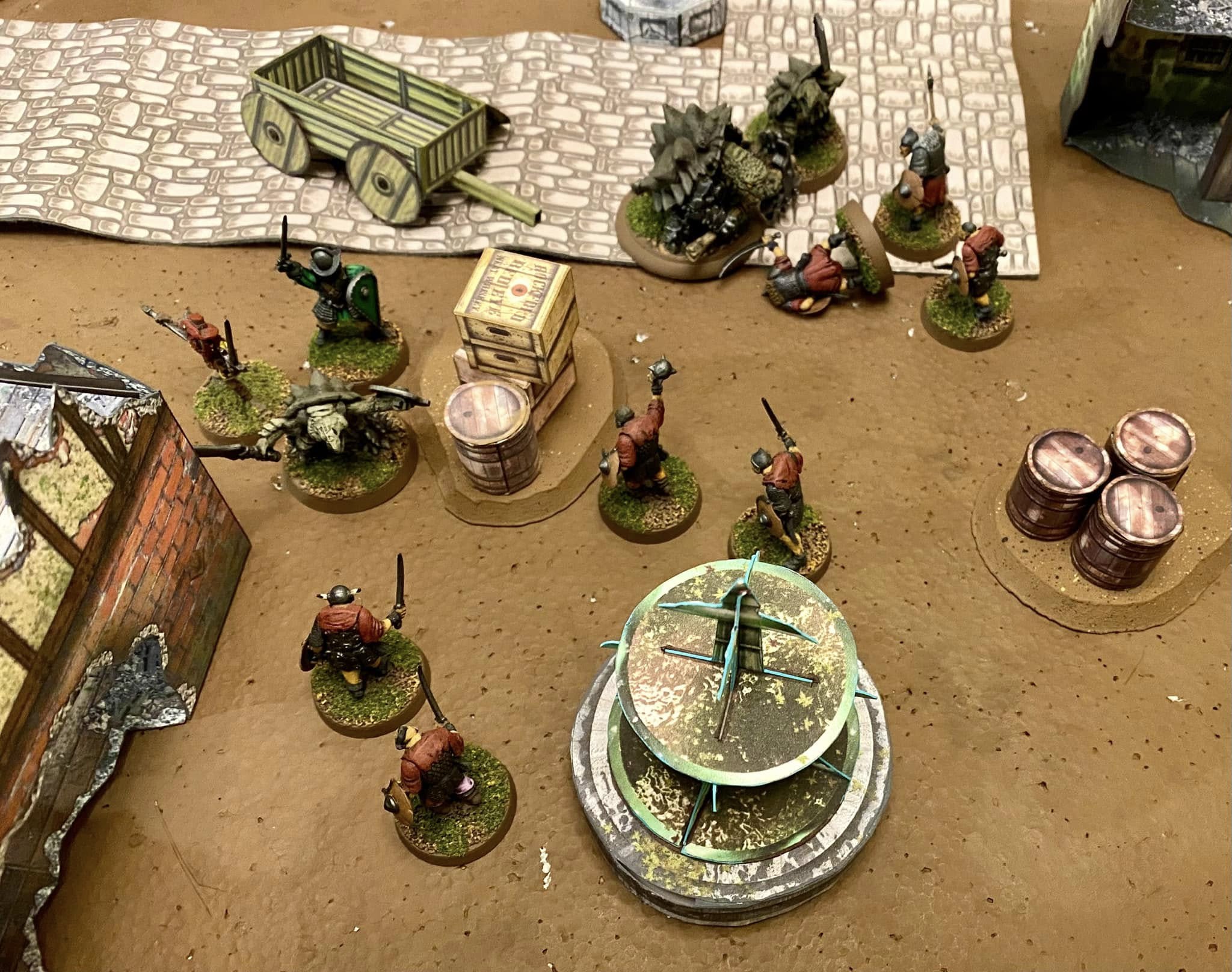 Thoughts: this was much easier a fight than it had any right to be: I rolled a LOT of "6"s for Our Heroes and a lot of "1"s for the Dusklings. "Line up and fight" was exactly what I needed for tonight, some mostly brainless fun with some permanent campaign consequences. I was working on some new scenrry so I'm not always using the same old buildings, but clearly I have not yet finished. With no Travel roll necessary next turn, I think we will move to Bradfordshire , which is outside the city proper and still has plenty of intact buildings and farms for some different scenic options for the next few games.